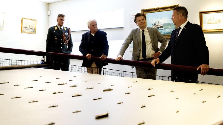 Eerst is er tijd voor minister Brekelmans om een kop koffie te drinken met de Katwijkers die hem vandaag ontvangen. Onder hen is Hubert Nijgh, voorzitter van de Stichting Koopvaardijpersoneel 1940-1945. Samen met Jacob Haasnoot, ook aanwezig en zelf kind van een koopvaardijveteraan, is hij verantwoordelijk voor de expositie ’Varen voor Vrijheid’ in het Katwijks Museum.