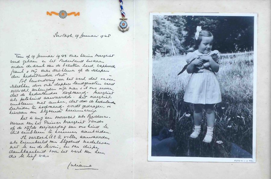 Het is mij een voorrecht als Beschermvrouwe van het Prinses Margriet Fonds op de vijfde verjaardag van ons kind U dit embleem te kunnen aanbieden.