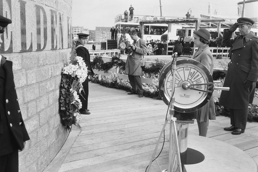Foto: Prinses Margriet onthult het oorlogsmonument De Boeg in Rotterdam - 10 april 1957